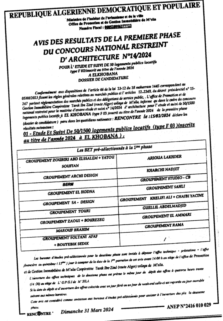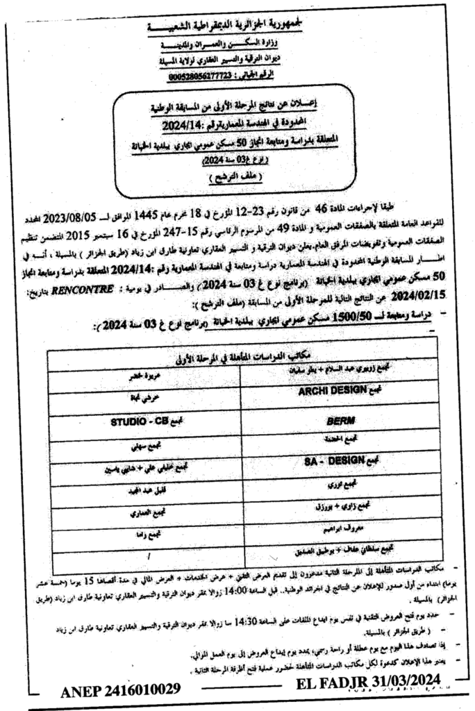 إعلان عن نتائج المرحلة الأولى من المسابقة الوطنية المحدودة في الهندسة المعمارية 2024/14: دراسة ومتابعة انجاز 50 مسكن عمومي ايجاري ببلدية الخبانة/ ديوان الترقية والتسيير العقاري لولاية المسيلة