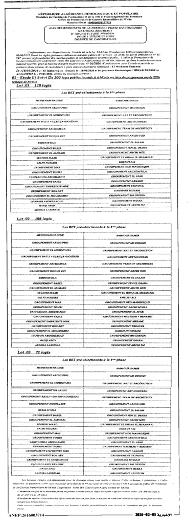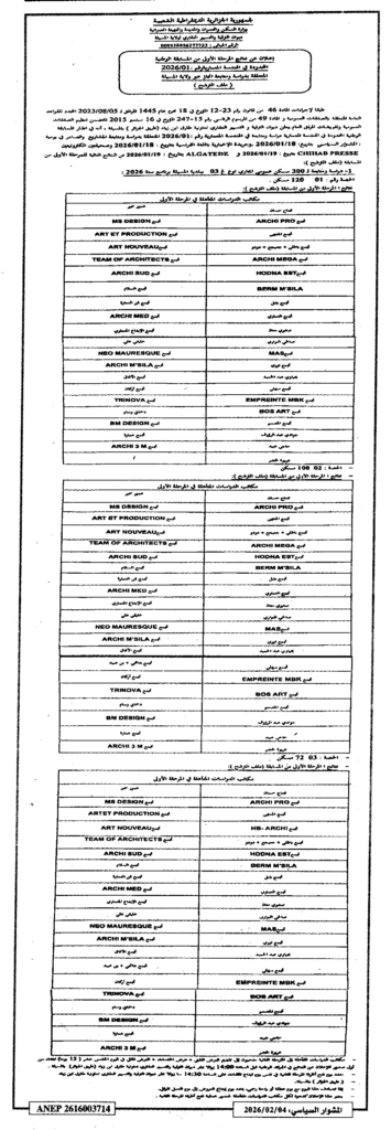 إعلان عن نتائج المرحلة الأولى من المسابقة الوطنية المحدودة في الهندسة المعمارية 2026/01 لدراسة ومتابعة انجاز عبر الولاية/ ديوان الترقية والتسيير العقاري لولاية المسيلة