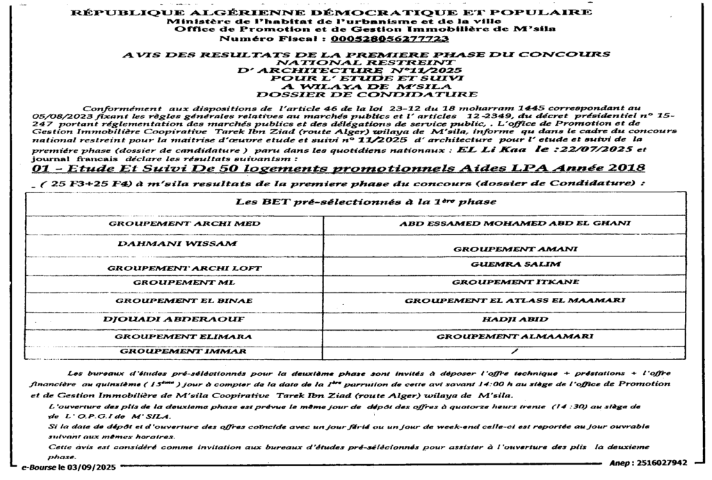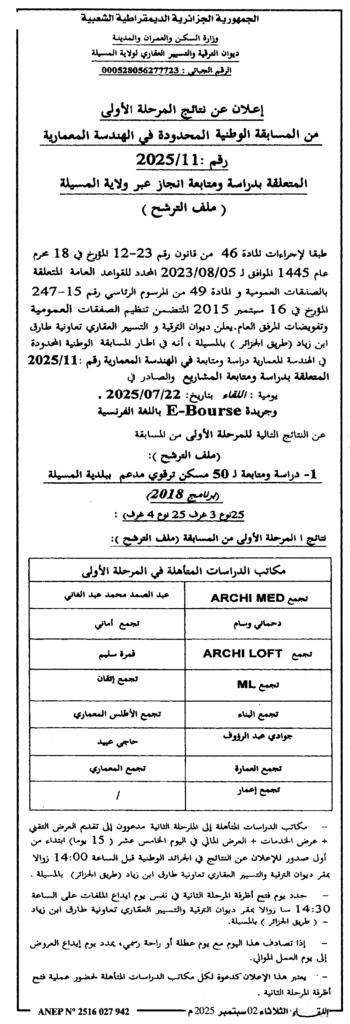 إعلان عن نتائج المرحلة الأولى من المسابقة الوطنية المحدودة في الهندسة المعمارية 2025/11 لدراسة ومتابعة انجاز عبر ولاية المسيلة