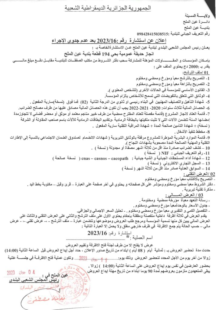 استشارة خاصة بـ : انجاز حديقة عمومية بحي 194 قطعة11 يونيو، 20230 3 شاركها فيسبوك X مشاركة عبر البريد طباعة