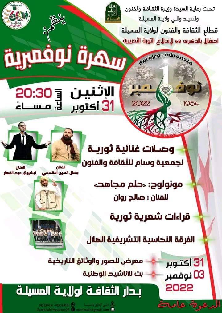 المسيلة/ في إطار الاحتفالات الرسمية بذكرى اندلاع الثورة التحريرية للفاتح نوفمبر 1954-2022  ، وتجسيدا للبرنامج الولائي المسطر بهذه المناسبة ،فإن قطاع الثقافة والفنون ينظم سهرة نوفمبرية يوم 31 أكتوبر 2022 على الساعة 20:30 سا مساءا