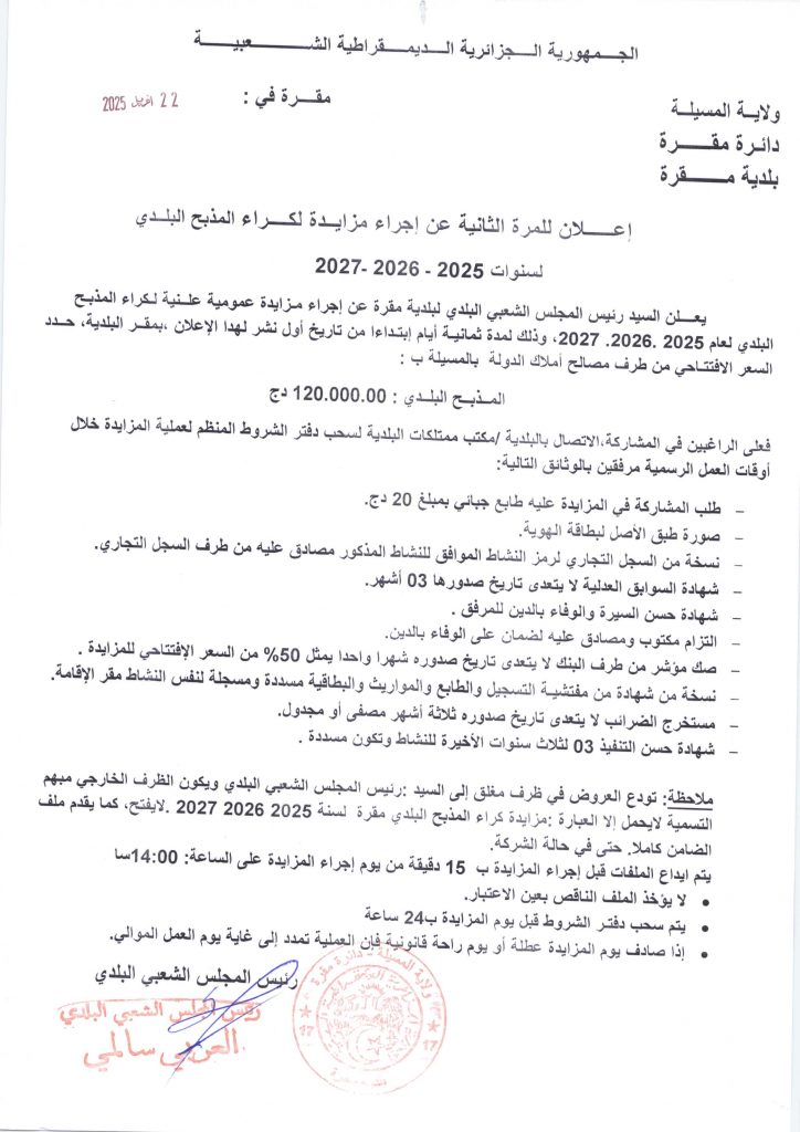 إعلان للمرة الثانية عن إجراء مزايدة لكراء المذبح البلدي لسنوات 2025 2026 و2027 ببلدية مقرة