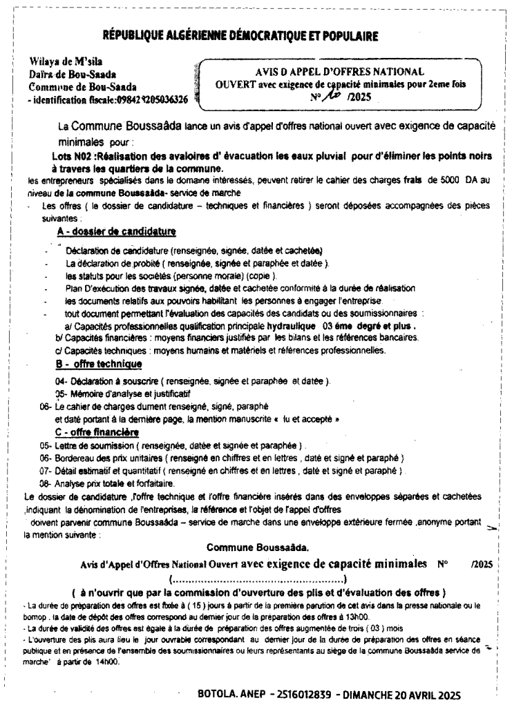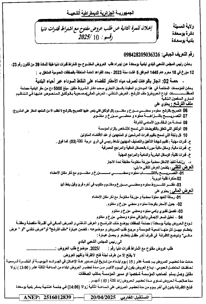 حصة 02: انجاز بالوعات لصرف مياه الأمطار للقضاء على النقاط السوداء عبر أحياء البلدية20 أبريل، 20250 17 شاركها فيسبوك X مشاركة عبر البريد طباعة