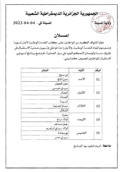 إعلان لولاية المسيلة: عملية الاستقبال على مكتب الخدمة الوطنية