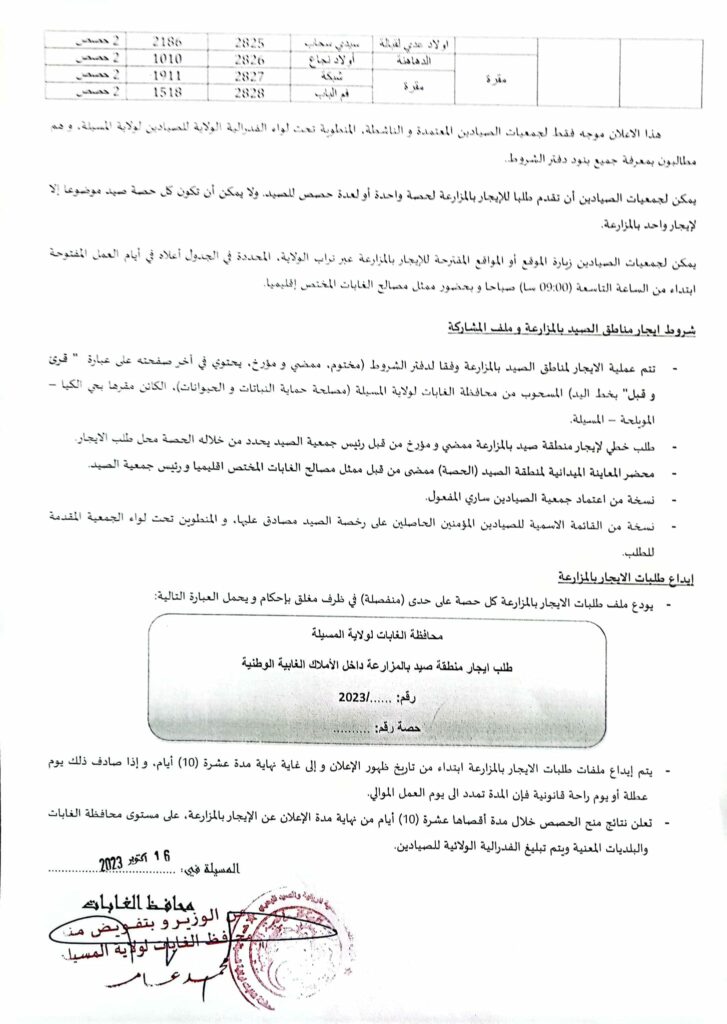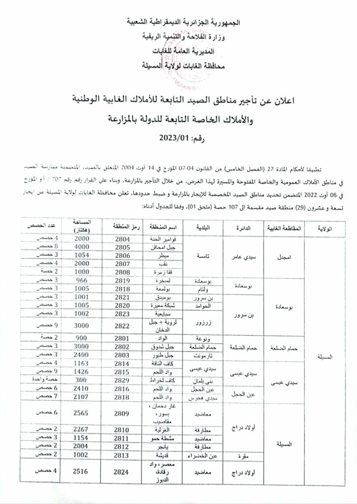 إعلان عن تأجير مناطق الصيد التابعة للأملاك الغابية الوطنية والأملاك الخاصة التابعة للدولة بالمزارعة.16 أكتوبر، 20230 12 شاركها فيسبوك X مشاركة عبر البريد طباعة