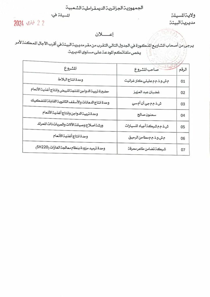 على السادة أصحاب المؤسسات المصنفة التقرب من مقر مديرية البيئة في أقرب الأجال.22 فبراير، 20240 2 شاركها فيسبوك X مشاركة عبر البريد طباعة