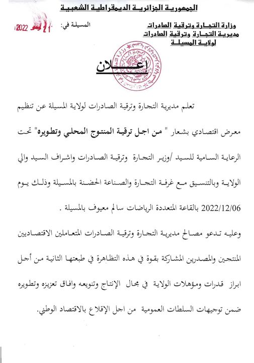 إعلان/ مديرية التجارة وترقية الصادرات لولاية المسيلة