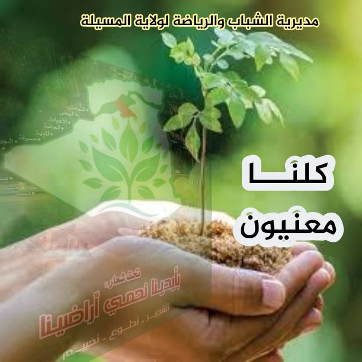 تحت رعاية السيد وزير الشباب والرياضة وباشراف والي ولاية المسيلة، في إطار المخطط الأخضر للشباب ومساهمة في تكوين السد الأخضر، تعلن مدير الشباب والرياضة لولاية المسيلة عن تنظيم الحملة الكبرى لتشجير تحت شعار: “بأيدينا نحمي أرضينا”، وهذا بالتنسيق مع المحافظة الولائية للغابات لولاية المسيلة.