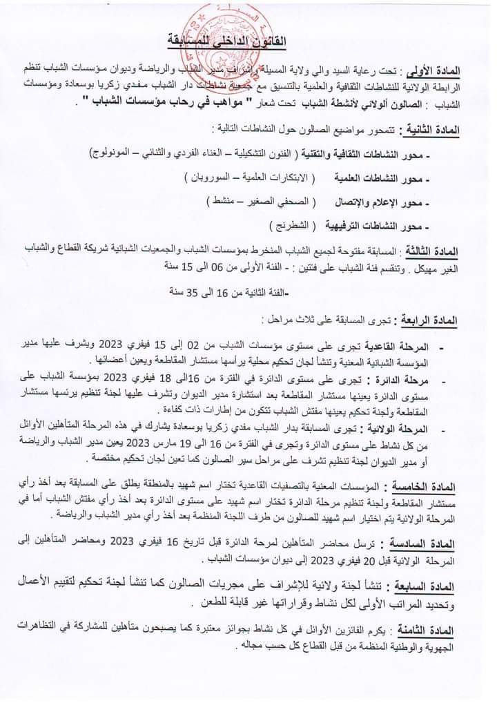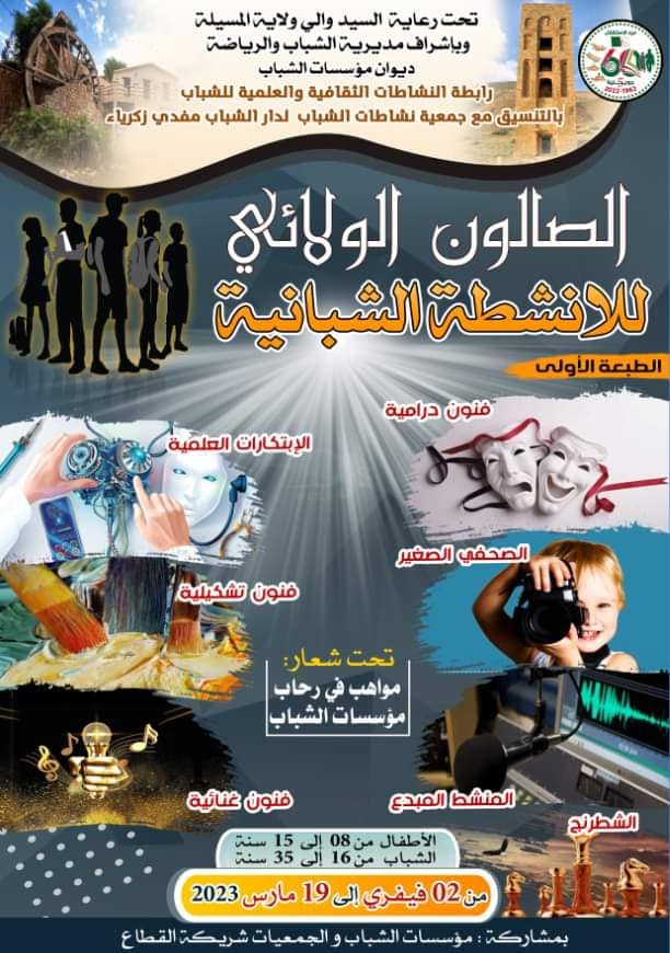 تنظيم الصالون الولائي لأنشطة الشباب من الفترة الممتدة 2فيفري إلى غاية 19 مارس1 فبراير، 20230 32 شاركها فيسبوك X مشاركة عبر البريد طباعة