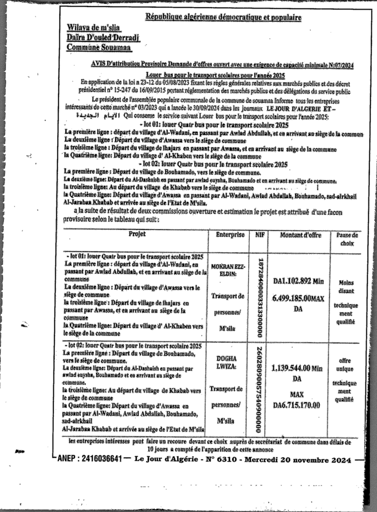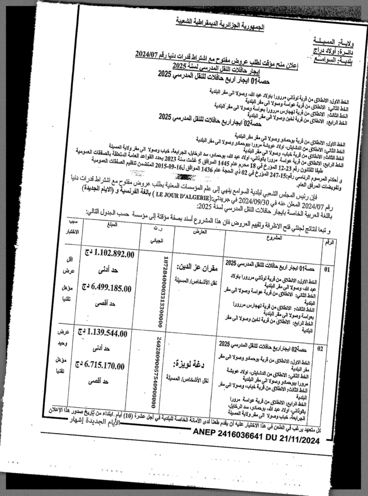 منح مؤقت لطلب عروض مفتوح 2024/07 مع اشتراط قدرات دنيا: ايجار 04 حافلات النقل المدرسي لسنة 2025/ بلدية السوامع24 نوفمبر، 20240 13 شاركها فيسبوك X مشاركة عبر البريد طباعة