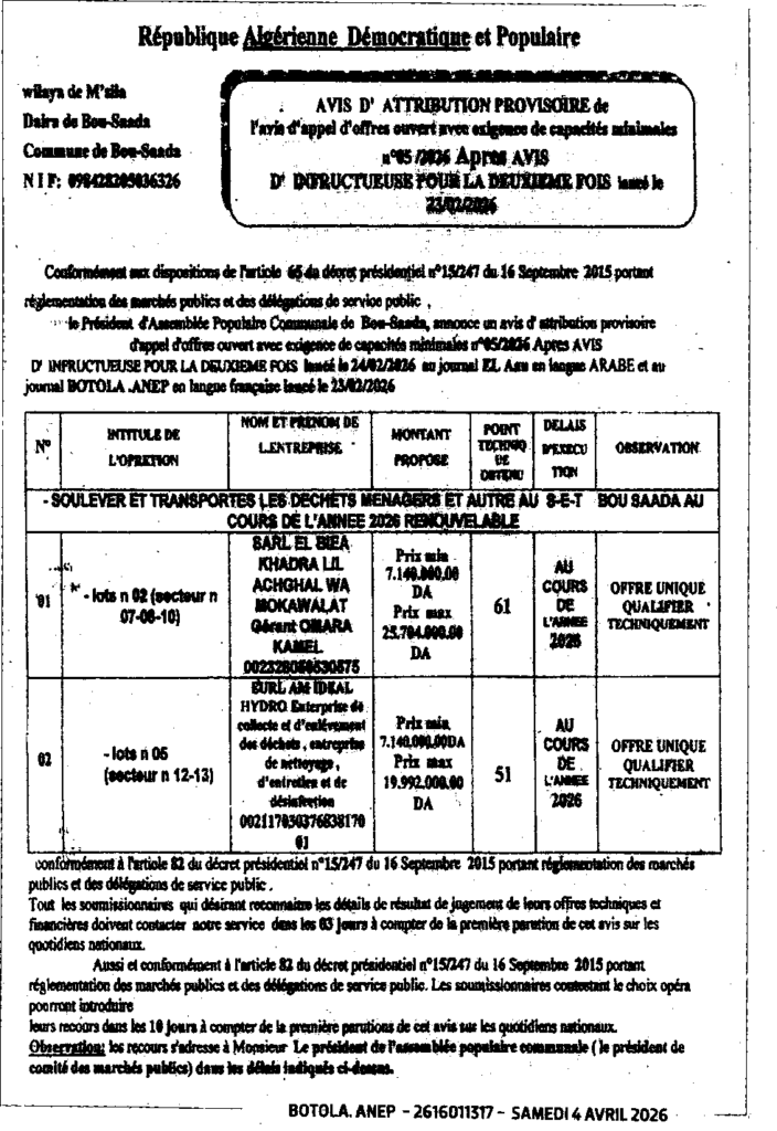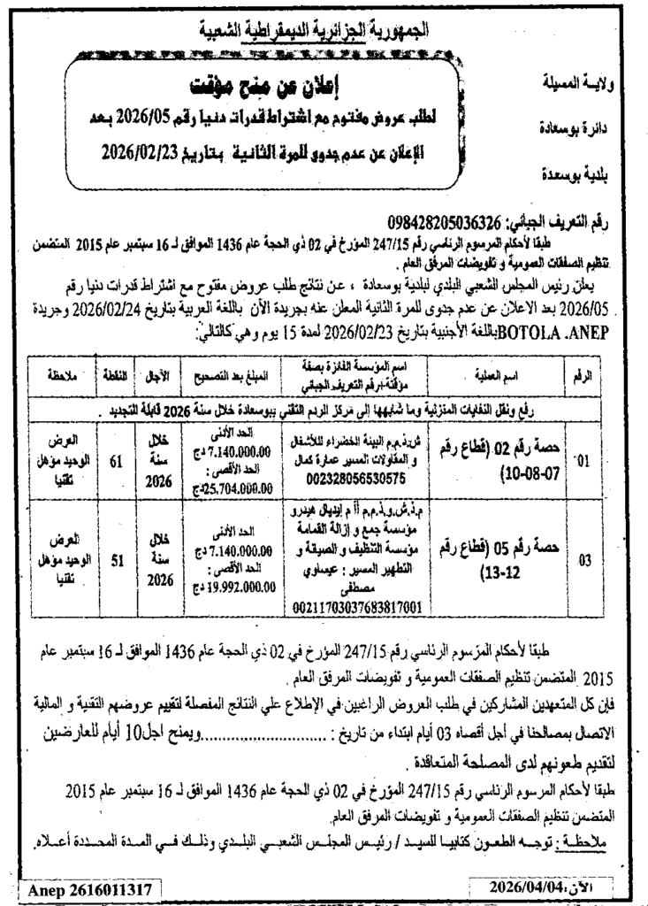 إعلان منح مؤقت لطلب عروض مفتوح 2026/05 بعدج الإعلان عن عدم جدوى للمرة الثانية/ بلدية بوسعادة