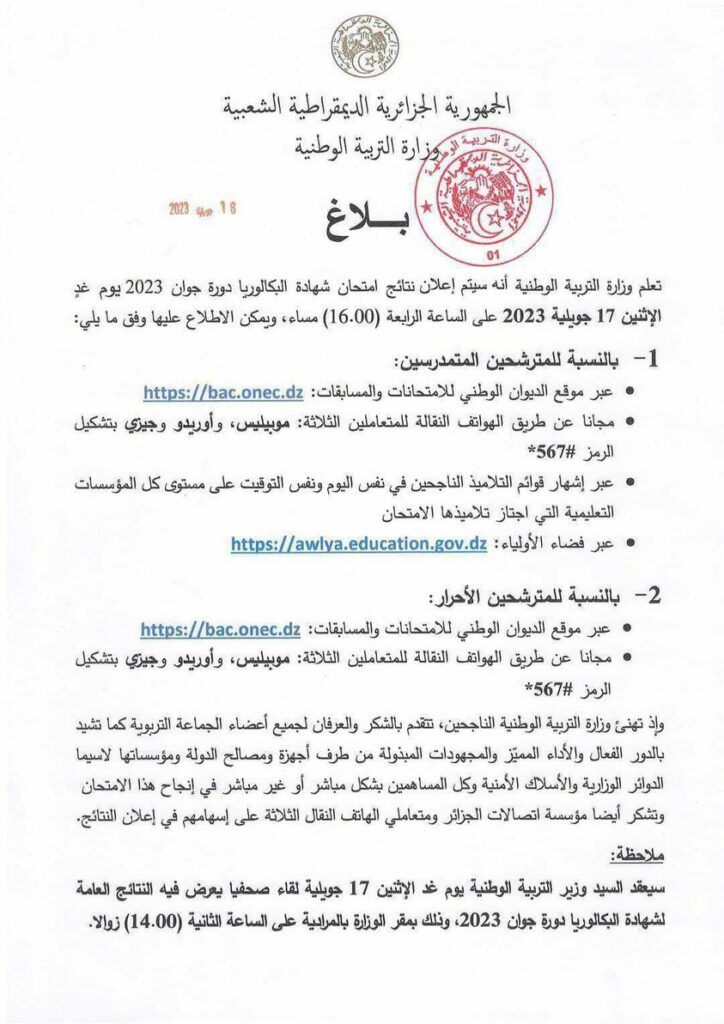 إعلان نتائج امتحان شهادة البكالوريا دورة جوان 2023