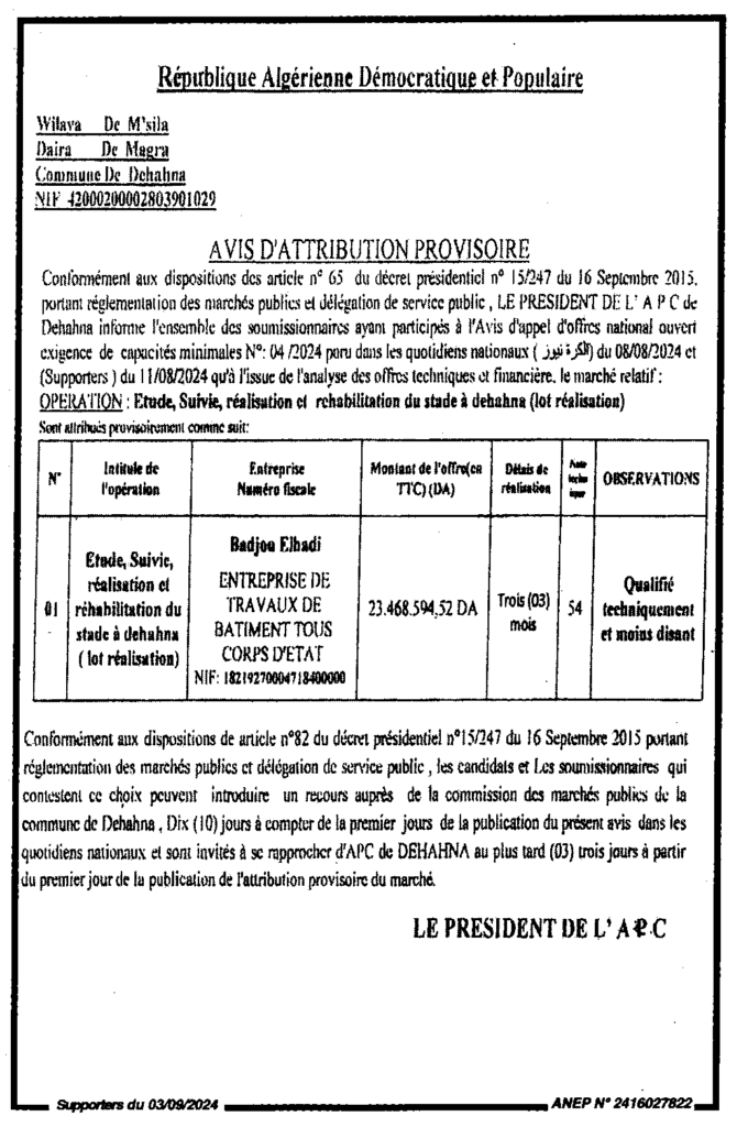 إعلان ن المنح المؤقت بلدية الدهاهنة
