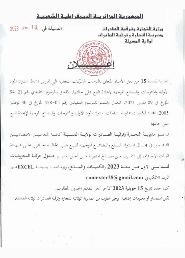 إعلان هام للمتعاملين الإقتصاديين الناشطين في مجال إستيراد السلع والبضائع الموجهة للبيع على الحالة18 يونيو، 20230 11 شاركها فيسبوك X مشاركة عبر البريد طباعة
