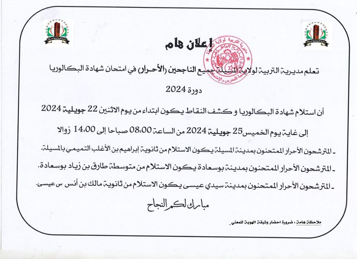 إعلان هـــام بخصوص الناجحين الأحرار في امتحان البكالوريا دورة 2024