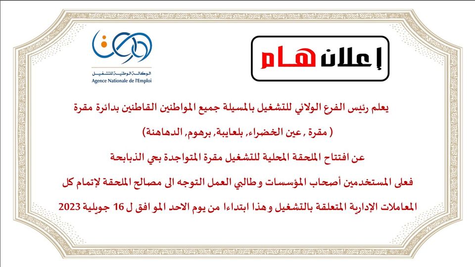 إعلان هــــام/ الوكالة الوطنية للتشغيل لولاية المسيلة