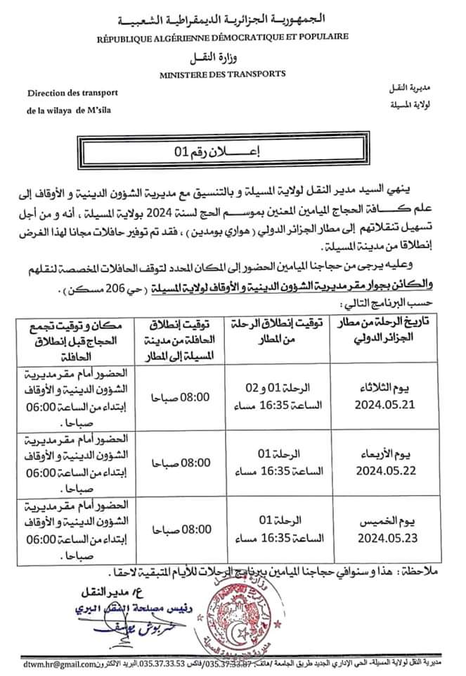 إعلان 01/ البرنامج الخاص بنقل الحجاج من مقر ولاية المسيلة إلى مطار هواري بومدين بالجزائر العاصمة