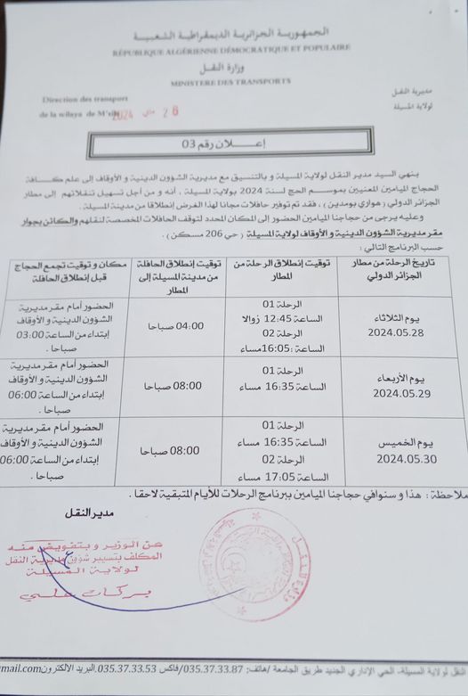 إعلان 03/ البرنامج الخاص بنقل الحجاج من مقر ولاية المسيلة إلى مطار هواري بومدين بالجزائر العاصمة