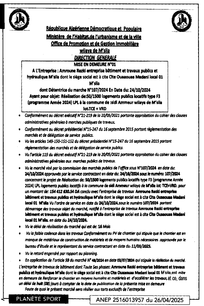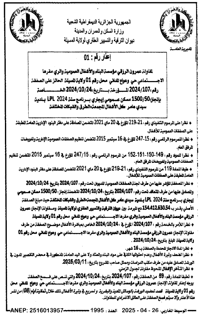 إعلذار رقم 01 ديوان الترقية والتسيير العقاري لولاية المسيلة