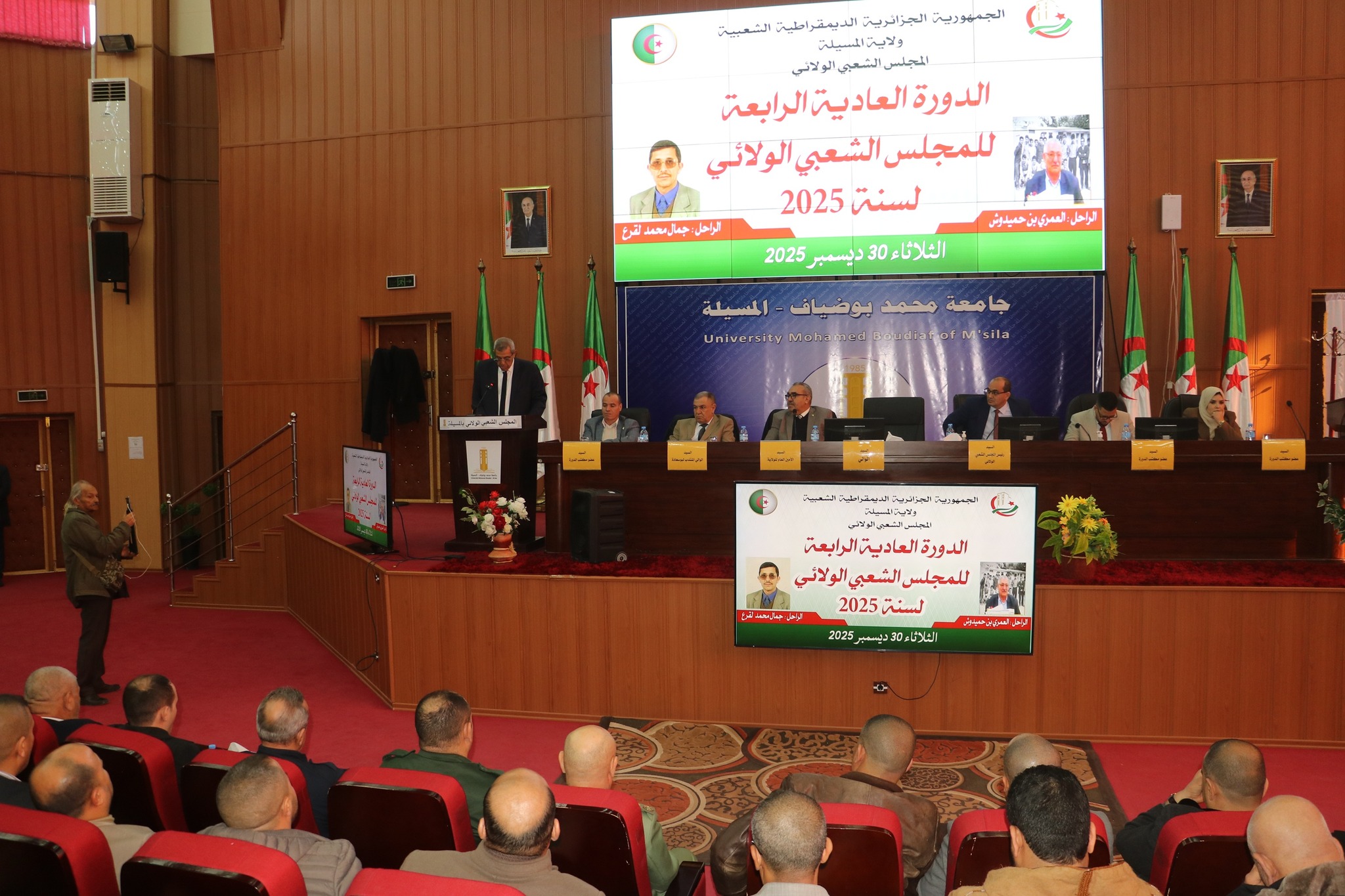 المسيلة/ اليوم الثلاثاء 30 ديسمبر 2025، بقاعة المحاضرات ابن الهيثم بالقطب الجامعي بجامعة محمد بوضياف المسيلة، برئاسة السيد رضا حمريط رئيس المجلس الشعبي الولائي بحضور السيد نجم الدين طيار والي الولاية والسيد الوالي المنتدب لبوسعادة، وكل من السيدات والسادة: أعضاء اللجنة الولائية للأمن، أعضاء المجلس الشعبي الولائي، مندوب وسيط الجمهورية، الأمين العام للولاية، المفتش العام للولاية، الأمين الولائي لمنظمة المجاهدين، أعضاء الأسرة الثورية، أعضاء المجلس الأعلى للشباب لولاية المسيلة، ممثل المرصد الوطنى للمجتمع المدني، رؤساء الدوائر، مدراء الهيئة التنفيذية للولاية، رؤساء المجالس الشعبية البلدية، المحافظ الولائي للكشافة الإسلامية، ممثلي المجتمع المدني والحركة الجمعوية والأسرة الاعلامية.