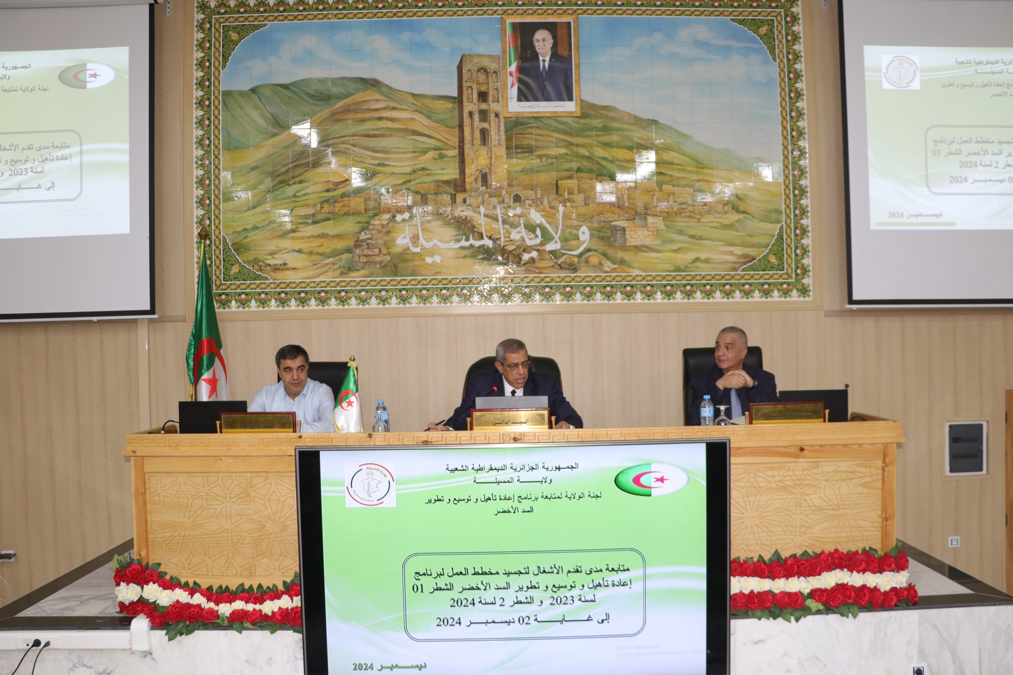 المسيلة/ في اطار المتابعة الدقيقة لحملة الحرث والبذر للموسم الفلاحي 2024-2025، ومن أجل تنفيذ استراتيجية فعالة وتجنيد كل الوسائل البشرية والمادية للزيادة في المساحات المزروعة عبر بلديات الولاية، والوصول إلى الأهداف المسطرة، ومتابعة تنفيذ قرار السيد عبد المجيد تبون رئيس الجمهورية، القاضي بإعادة بعث وتطوير وتوسيع مشروع السد الأخضر، ومتابعة لتقييم مدى تجسيد مختلف العمليات المسجلة في برنامج تأهيل وتوسيع وتطوير السد الأخضر على مستوى بلديات إقليم ولاية المسيلة شطر 2023 – 2024، ترأس اليوم الإثنين 02 ديسمبر 2024 السيد نجم الدين طيار والي الولاية، بقاعة الاجتماعات نور الدين صحراوي مقر الولاية، إجتماعا تقييميا، بحضور السيد الوالي المنتدب للمقاطعة الإدارية بوسعادة، السيد الأمين العام للولاية، السيدة والسادة: رؤساء الدوائر، المصالح الأمنية، السادة مدراء: المصالح الفلاحية، محافظ الغابات، مدير التجارة، مدير الغرفة الفلاحية، مدير التعاونية الحبوب والبقول الجافة CCLS، مدير مركز توزيع سونلغاز بالمسيلة، رؤساء الاقسام الفرعية الفلاحية للدوائر، ممثلي مجمع الهندسة الريفية، ممثل المكتب الوطني للدراسات التنمية الريفية، المحافظ الجهوى لتطوير السهوب وملحقين بالديوان.