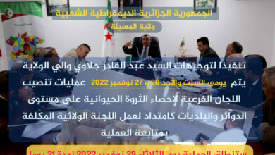 المسيلة/ ترأس اليوم الأحد 26 أكتوبر 2025 السيد نجم الدين طيار والي الولاية إجتماعا تنسيقيا، بقاعة الاجتماعات أحمد الغازي بمقر الولاية، بحضور السادة: مدير الإدارة المحلية، رؤساء دوائر: عين الملح، سيدي عيسى، سيدي عامر، الخبانة، الشلال، مقرة، أولاد دراج، رؤساء المجالس الشعبية لبلديات: عين الملح، بني ايلمان، مقرة، عين الخضراء، أولاد دراج، المعاضيد، أولاد عدي القبالة، أولاد ماضي، الحوامد، رؤساء المصالح، ملحق بالديوان.
