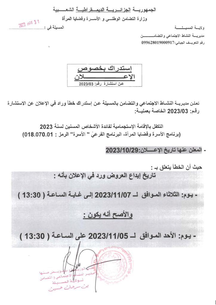 استدراك بخصوص الإعلان عن استشارة 2023/03 مديرية النشاط الاجتماعي والتضامن