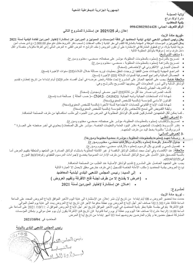 إعلان عن استشارة 2021/25: توريد مادة الزيت بلدية المعاضيد
