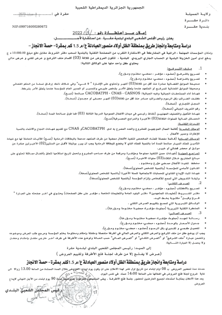 استشارة لأجل دراسة ومتابعة وانجاز طريق بمنطقة الظل أولاد منصور العبادلة ع/م 1.5 كم بمقرة -حصة الإنجاز-
