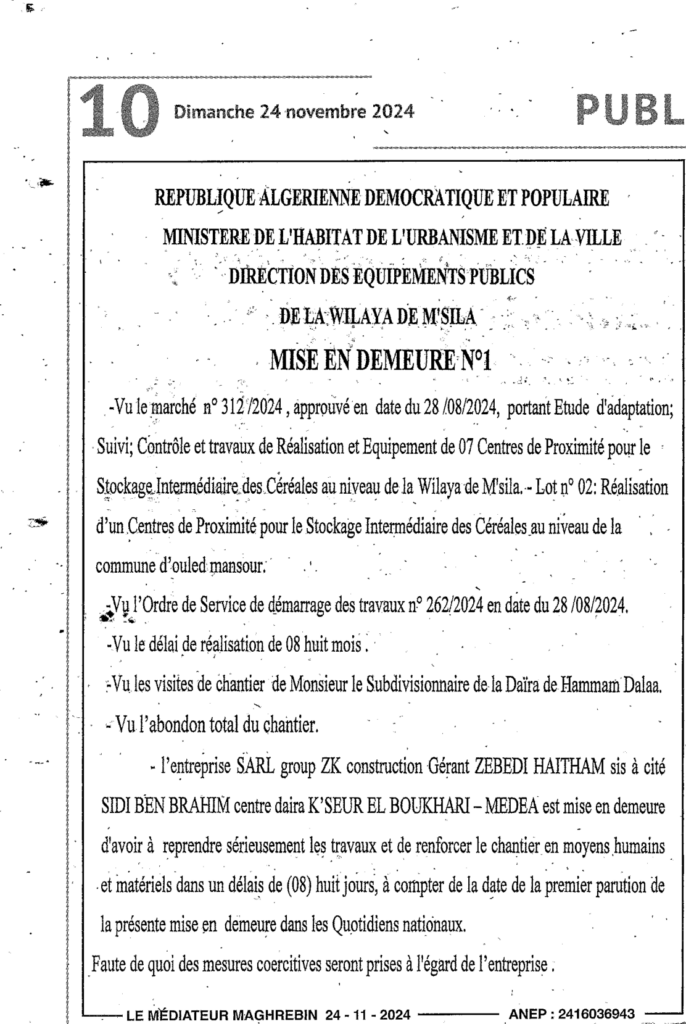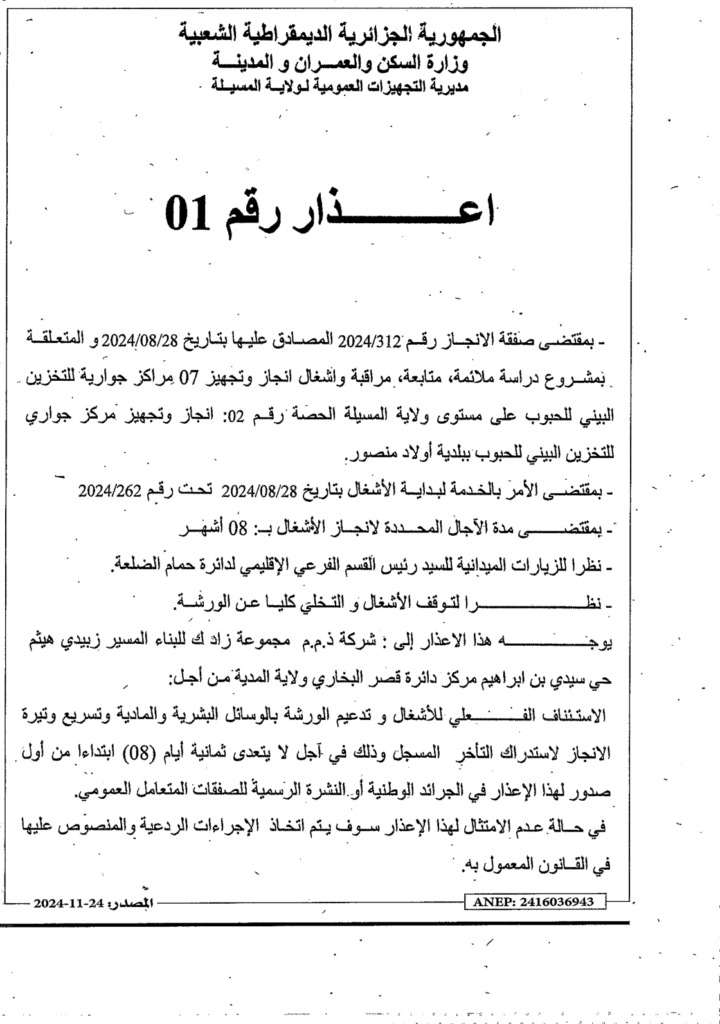 اعذار رقم 01 مديرية التجهيزات العمومية لولاية المسيلة