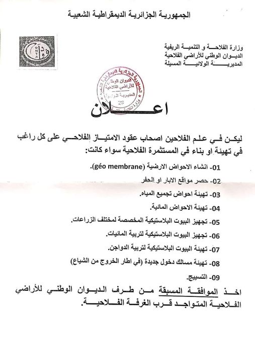 اعلان الديوان الوطني للأراضي الفلاحية المديرية الولائية المسيلة: أخذ الموافقة لتهيئة أو بناء في المستثرة الفلاحية