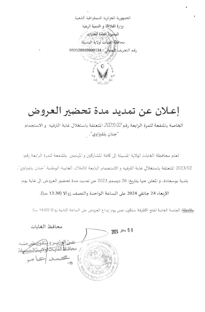 اعلان عن تمديد مدة تحضير العروض الخاصة بالمنفعة للمرة الرابعة 2023/02 باستغلال غابة الترفيه والاستجمام “جنان بلقيزاوي” ببلدية بوسعادة
