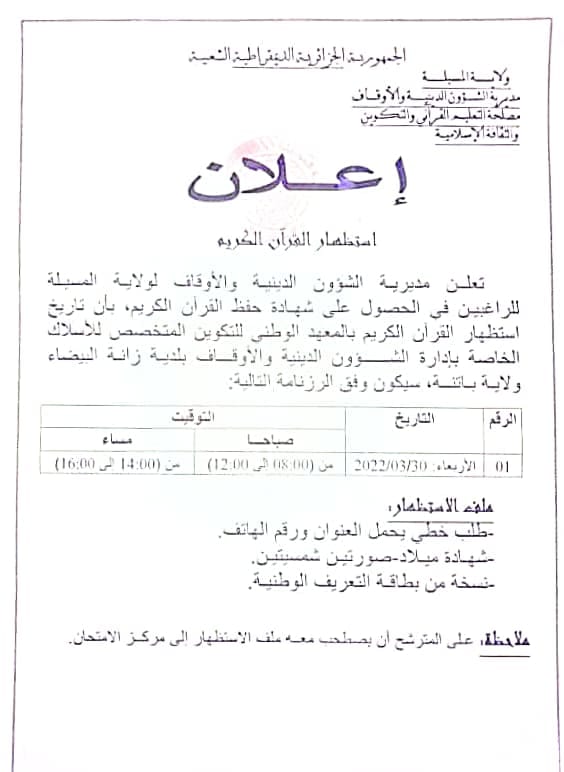 اعلان مديرية الشؤون الدينية والأوقاف: استظهار القرآن الكريم
