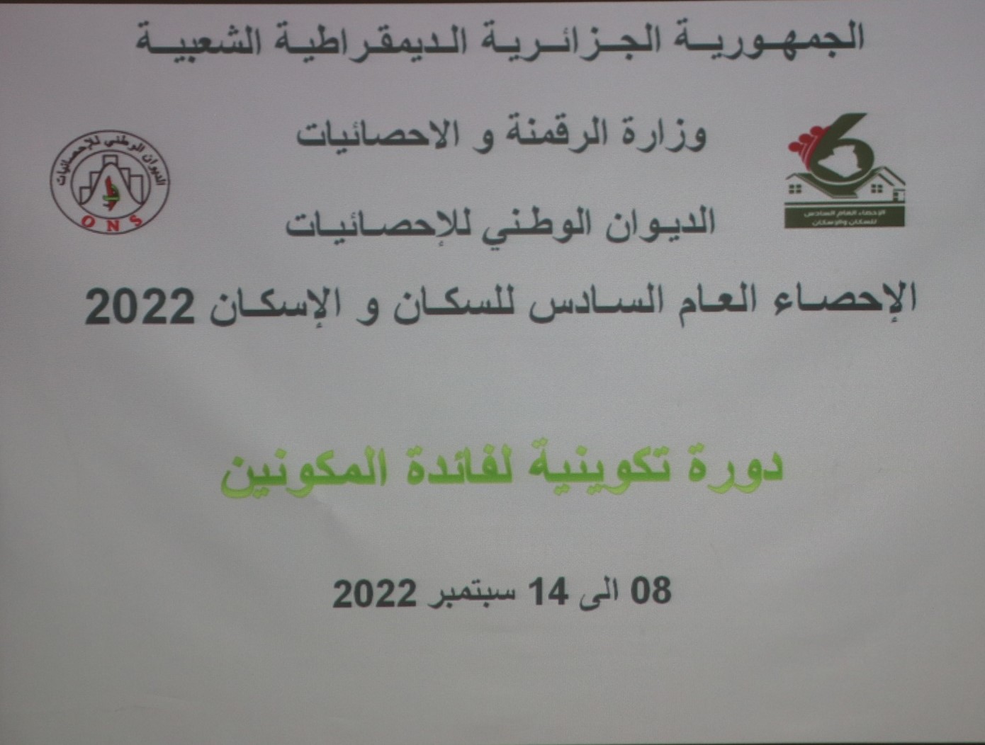 الدورة التكوينية تمتد من 08 سبتمبر إلى 14 سبتمبر 2022، في إطار التحضيرات الجارية لانطلاق عملية الإحصاء العام السادس للسكان والإسكان 2022 بولاية المسيلة المبرمج من 25 سبتمبر إلى 09 أكتوبر 2022 والمنظم تحت شعار “نحصي حاضرنا لنصنع مستقبلنا”
