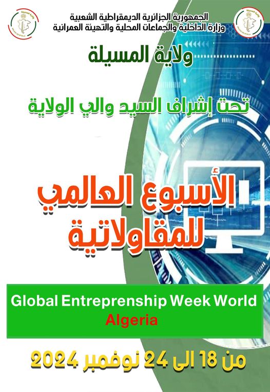 المسيلة/ تحت الرعاية السامية للسيد عبد المجيد تبون رئيس الجمهورية باشراف السيد نجم الدين طيار والي ولاية المسيلة، ولايةالمسيلة تنظم بالتنسيق مع الدوائر الوزارية المختلفة فعاليات الأسبوع العالمي للمقاولاتية تحت شعار ” المقاولاتية للجميع”، خلال الفترة الممتدة من 2024/11/18 إلى 2024/11/24.