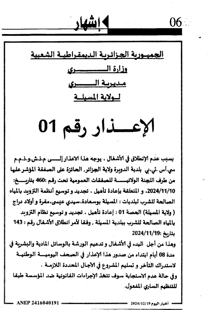 الإعذار رقم 01 مديرية الري بولاية المسيلة