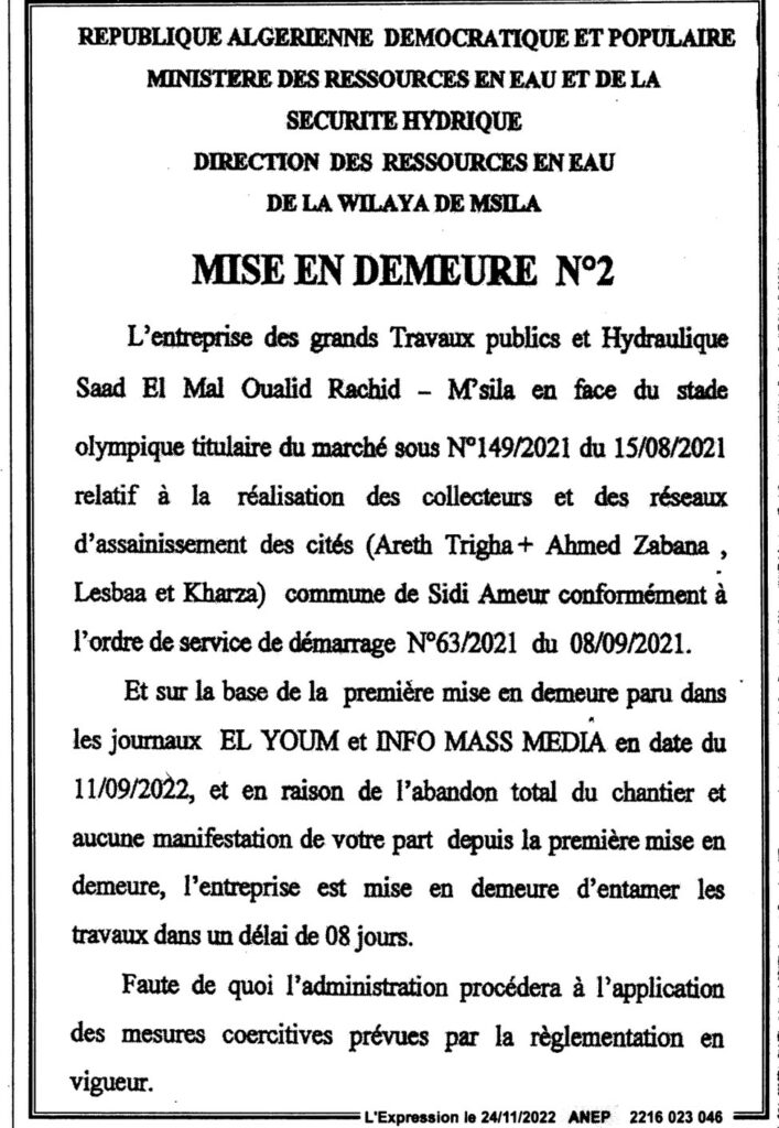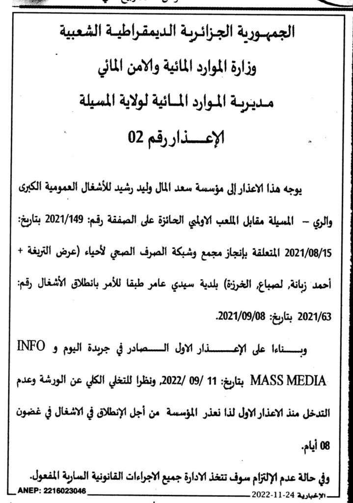 الإعذار رقم 02/ مديرية الموارد المائية لولاية المسيلة