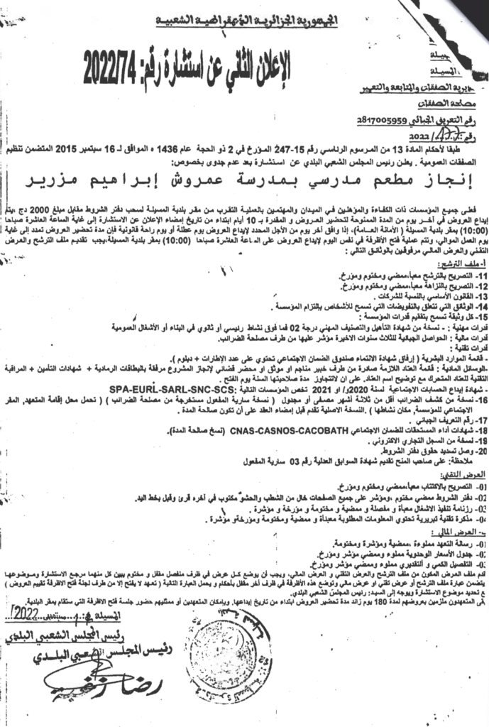 استشارة بعد عدم حدوى بخصوص: إنجاز مطعم مدرسي بمدرسة عمروش ابراهيم مزرير19 سبتمبر، 20220 19 شاركها فيسبوك X مشاركة عبر البريد طباعة