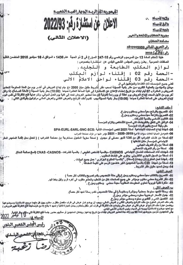 استشارة بخصوص: لوازم المكتب الطابعة والتجليد.الحصة رقم 02: إقتناء لوازك المكتب.الحصة رقم 03: إقتناء لواحق الإعلام الآلي.16 نوفمبر، 20220 55 شاركها فيسبوك X مشاركة عبر البريد طباعة