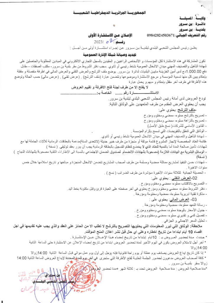 استشارة أولى من أجل: تجديد وصيانة شبكة الإنارة العمومية14 مارس، 20230 51 شاركها فيسبوك X مشاركة عبر البريد طباعة