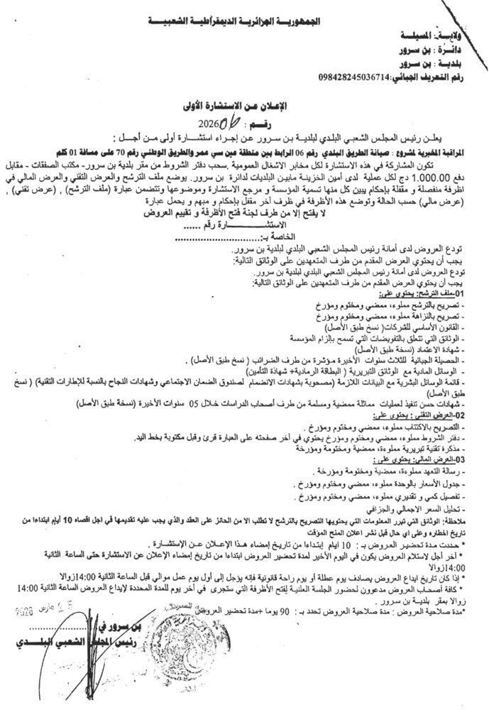 الإعلان عن الاستشارة الأولى 2026/06 بلدية بن سرور