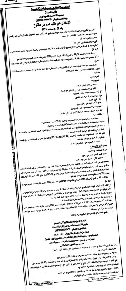 الإعلان عن طلب عروض مفتوح 2023/02 مديرية التكوين والتعليم المهنيين
