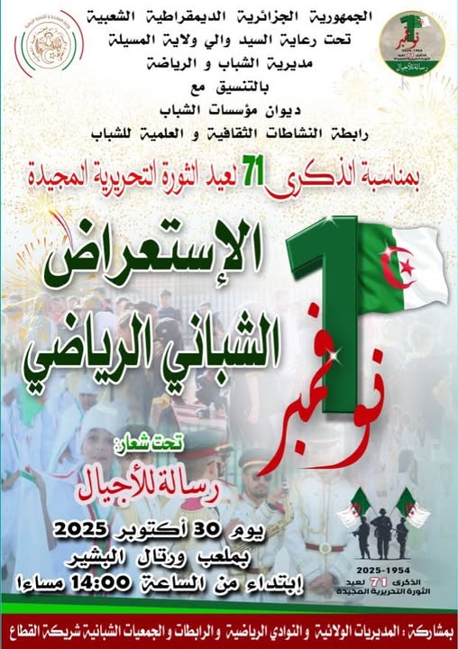 المسيلة/ بمناسبة الذكرى الـ71 لاندلاع ثورة أول نوفمبر المجيدة، تحت شعار “رسالة للأجيال” تنظم مديرية الشباب والرياضة لولاية المسيلة استعراضًا رياضيًا شبانيًا احتفاليًا، وذلك يوم الخميس 30 أكتوبر 2025 بملعب ورتال البشير ابتداءً من الساعة الثانية بعد الزوال (14:00).