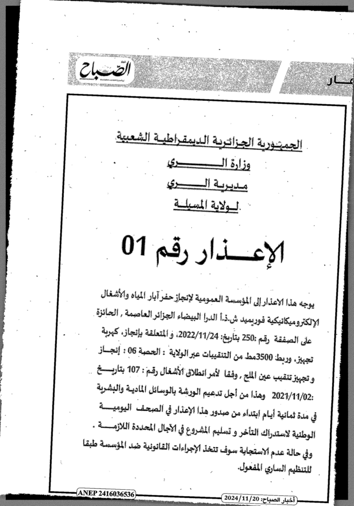 الاعذار رقم 01/ مديرية الري لولاية المسيلة