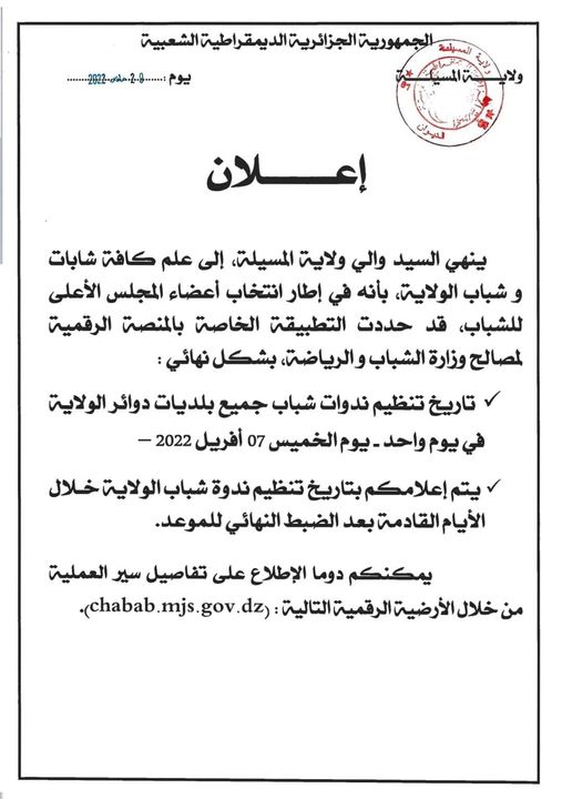 الاعلان لولاية المسيلة: انتخاب أعضاء المجلس الأعلى للشباب