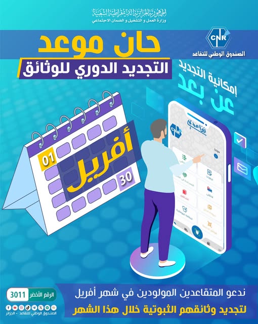 حان موعد التجديد الدوري للوثائق للمتقاعدين المولودين في شهر أفريل، في إطار التجديد السنوي للوثائق الثبوتية، يدعو الصندوق الوطني للتقاعد المستفيدين من منحة أو معاش تقاعد المولودين في شهر أفريل إلى تجديد وثائقهم الثبوتية، وذلك خلال شهر أفريل 2025.