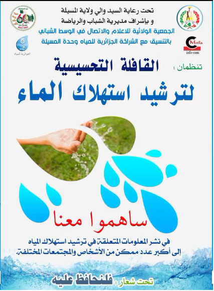 مديرية الشباب والرياضة ـ المسيلة ـ خلية الاعلام والاتصال/ في إطار المبادرة التي اطلقتها مديرية الشباب والرياضة لولاية المسيلة الخاصة بعملية التحسيس لترشيد استهلاك الماء عبر بلديات الولاية، وهذا تحت شعار: “فلنحافظ عليه”