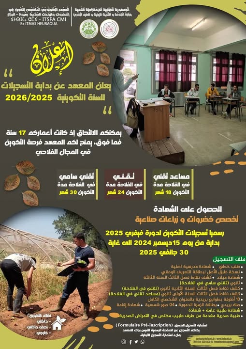 المعهد التكنولوجي المتخصص للتكوين في الخضروات والزراعات الصناعية بهراوة، بداية التسجيلات للسنة التكوينية 2026/2025، دورة فيفري 2025 إلى غاية 30 جانفي 2025 للحصول على شهادة في تخصص خضروات والزراعات صناعية.