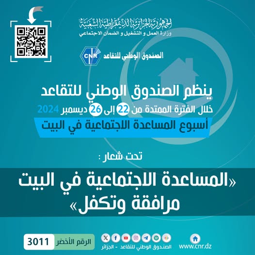 ينظم الصندوق الوطني للتقاعد خلال الفترة الممتدة من 22 إلى 26 ديسمبر 2024، الطبعة الثالثة لأسبوع المساعدة الاجتماعية في البيت تحت شـعار: ” المساعدة الاجتماعية في البيت، مرافقة وتكفل”، بهدف التعريف بالآليات التي تم تسخيرها لفائدة المتقاعدين وذوي الحقوق لاسيما المعطوبين، العجزة والمعاقين، من أجل أنسنة العلاقة والتكفل الأمثل بإنشغالاتهم.