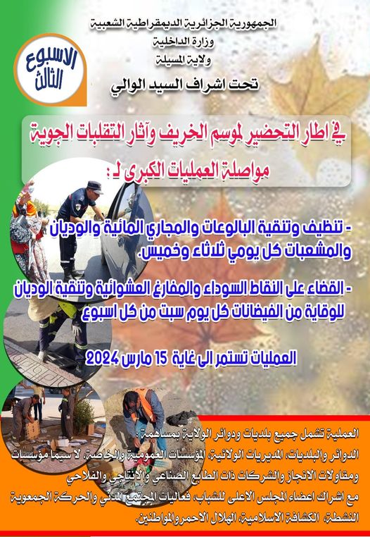 المسيلة/ تحت إشراف السيد والي الولاية، تتواصل العمليات الكبرى للتحضير لموسم الخريف وآثار التقلبات الجوية عبر جميع بلديات ودوائر الولاية.